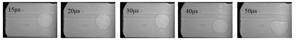 同步辐射单脉冲X射线超快成像在激光加载后不同时刻取得的水中气泡的瞬态图像