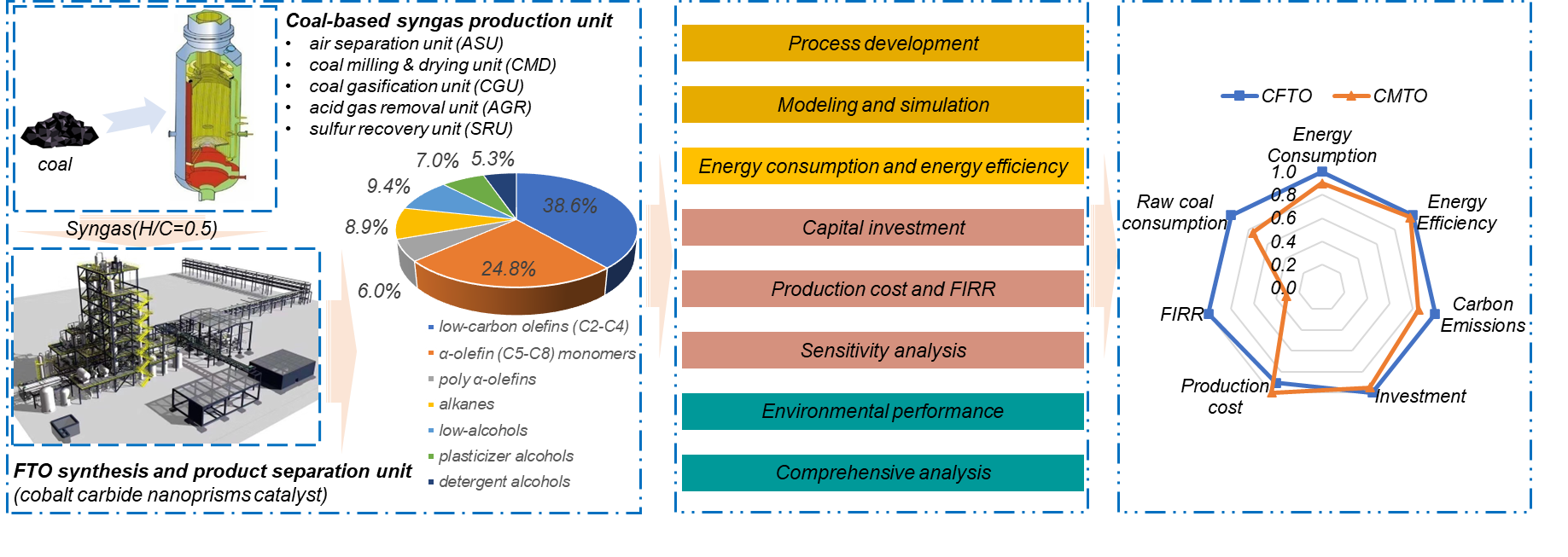 本文从工程科学角度,以煤经合成气直接制烯烃(CFTO)为例,针对其复杂产物物系(存在大量多元共沸的多相多组分物系),对其产物分离加工与产品方案进行了系统设计研究(Fig.1);顺利获得Aspen Plus软件对煤经合成气直接制烯烃全过程(从煤炭到产品)进行了模拟计算;与煤经甲醇制烯烃(CMTO)进行了技术-经济-环境比较分析(Fig.2),包括过程能耗、能效、碳排放、生命周期分析(LCA)(Fig.3)、经济性等。研究表明:1)基于建立的产物分离路线与产品方案设计,CFTO路线能够形成低碳烯烃(C2-C4)、α-烯烃(C5-C8)、PAO、混合烷烃溶剂油、低碳混合醇、洗涤剂醇和增塑剂醇等产品链。2)较之于CMTO,基于此流程的CFTO能耗降低10.1%、二氧化碳总排放降低14.8%、工艺直接二氧化碳排放降低42.6%。CFTO的财务内部收益率为17.39%(优于相同煤价等条件下CMTO路线)。该研究为相关复杂物系分离方案设计和有关能源转化技术的系统评估给予了参考。