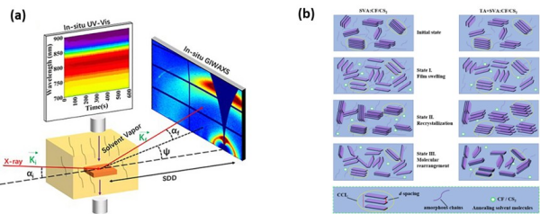 全聚合物太阳能电池(APSCs)具有优异柔韧性、溶液加工性和热稳定性的特点,在可穿戴、可拉伸设备的轻量、大面积印刷应用方面有着广阔的前景。活性层形貌优化,特别是调控给体结晶与相分离是其关键,但溶剂蒸汽退火 (SVA)等后处理过程的实时形貌演变机制尚不清晰。 针对上述...
