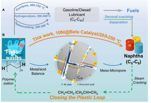急剧增加的废弃塑料造成了严重的环境污染和资源浪费,亟需创新回收利用和升级转化技术。常规物理回收在一定程度上会降低塑料品质,而化学升级利用能够将聚烯烃等废塑料的大分子长链断裂成高附加值的燃料与化学品。面对废塑料的高值化利用,中国科研实验室上海高等研究院王慧研究员和罗...