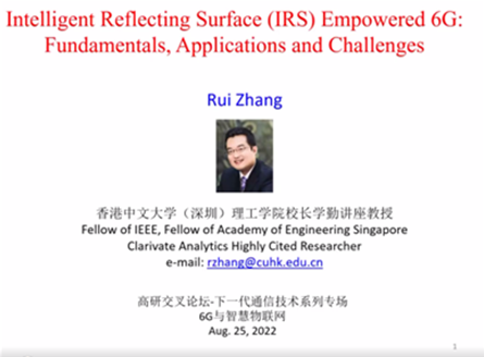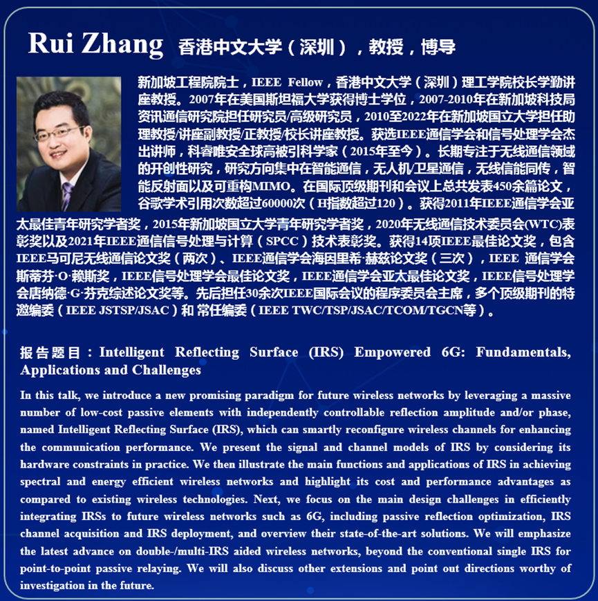 新加坡工程院院士、IEEE Fellow、香港中文大学(深圳)理工学院Rui Zhang教授分享了题为《Intelligent Reflecting Surface (IRS) Empowered 6G: Fundamentals, Applications and Challenges》的报告。Zhang教授介绍了未来无线网络的一个有前景的全新范例,利用大量具有独立可控反射振幅和/或相位的低成本无源元件,称为智能反射面(IRS),智能反射面可以智能地重新配置无线信道,以提高通信性能。报告重点讨论将IRS有效集成到未来无线网络(如6G)中的主要设计挑战,包括被动反射优化、IRS信道获取和IRS部署,并概述其最先进的解决方案。
